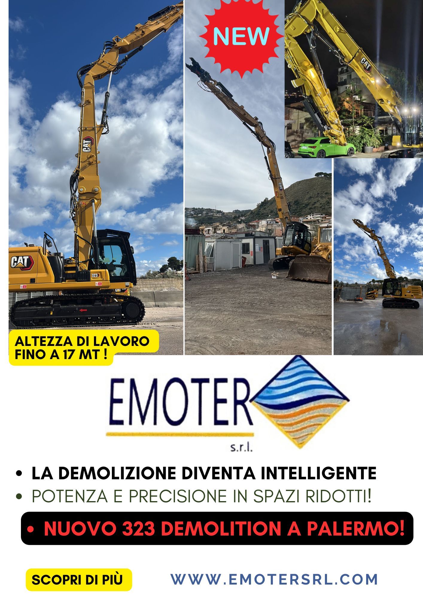 Se la tua impresa edile o di costruzioni necessita di una macchina robusta, precisa e versatile per interventi in quota, EMOTER S.r.l. ha la risposta: il Nuovo CAT 323 Demolition. Siamo orgogliosi di portare l'innovazione della demolizione a Palermo e in tutta la regione, offrendo una soluzione che ridefinisce gli standard di efficienza e sicurezza.