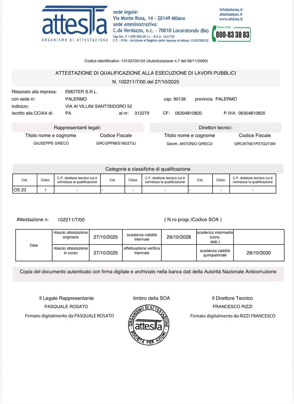 - ✅ Cosa Significa: La SOA dimostra che Emoter S.r.l. possiede tutti i requisiti di capacità economica, finanziaria, tecnica e organizzativa richiesti per partecipare a gare d'appalto pubbliche.