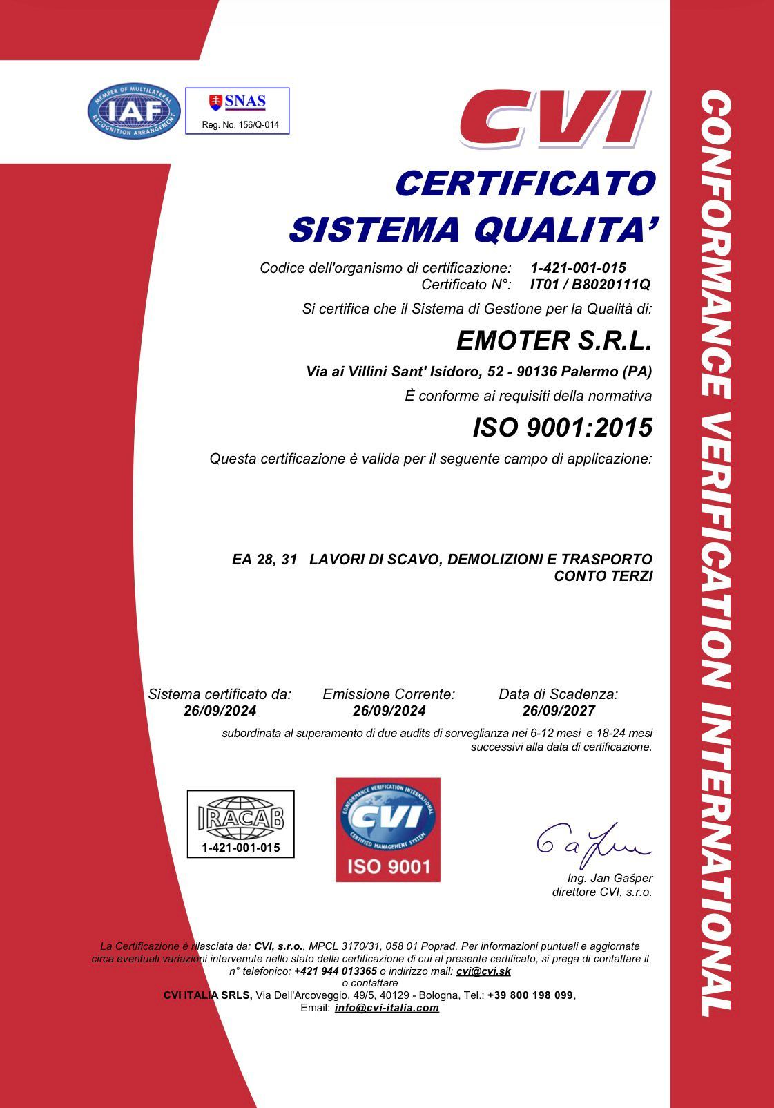 Le Nostre Certificazioni: Garanzia di Qualità e Affidabilitàn Emoter S.r.l., l'eccellenza non è solo un obiettivo, ma uno standard operativo garantito da un solido sistema di certificazioni. Questi riconoscimenti attestano il nostro impegno costante verso la qualità dei processi, la sicurezza in cantiere e la conformità normativa, posizionandoci come un partner affidabile per lavori pubblici e privati a Palermo e in tutta la Sicilia.